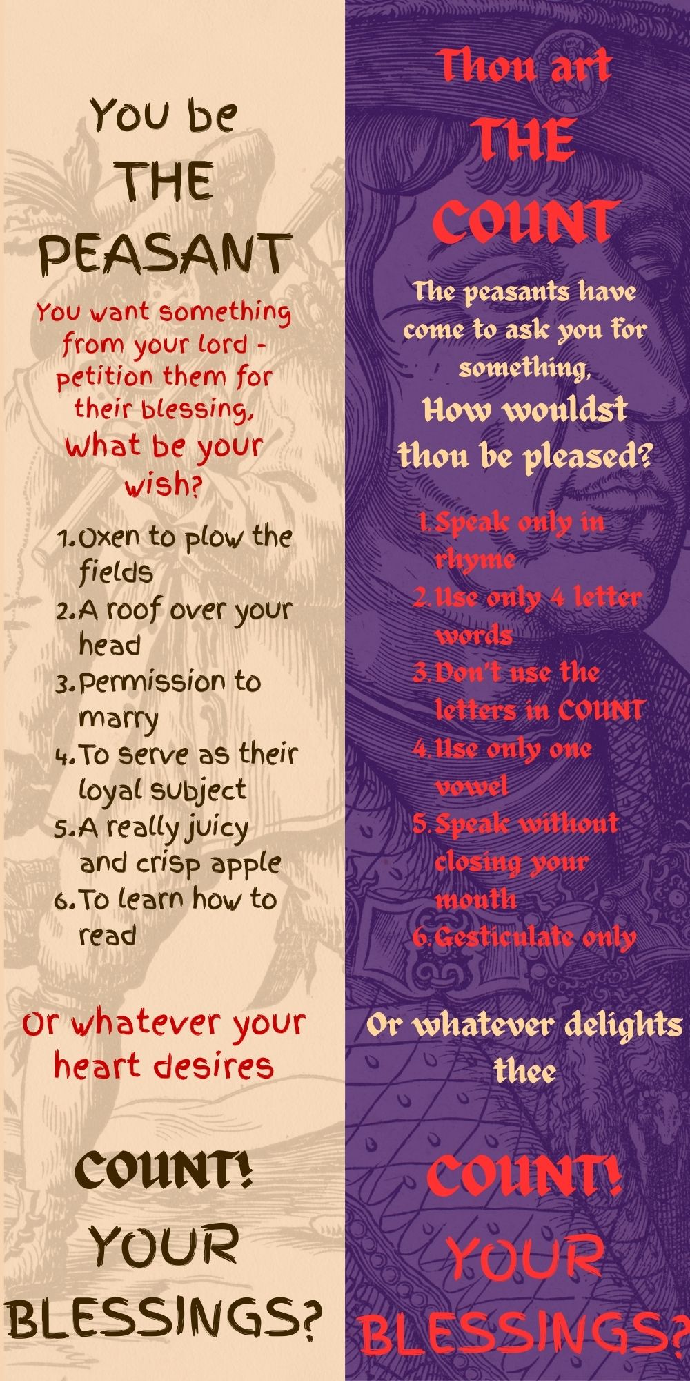 A simple 2 player game in which one person plays the role of a peasant seeking something from their master and the other portrays their benevolent Lord wanting to amuse themselves with their subjects.