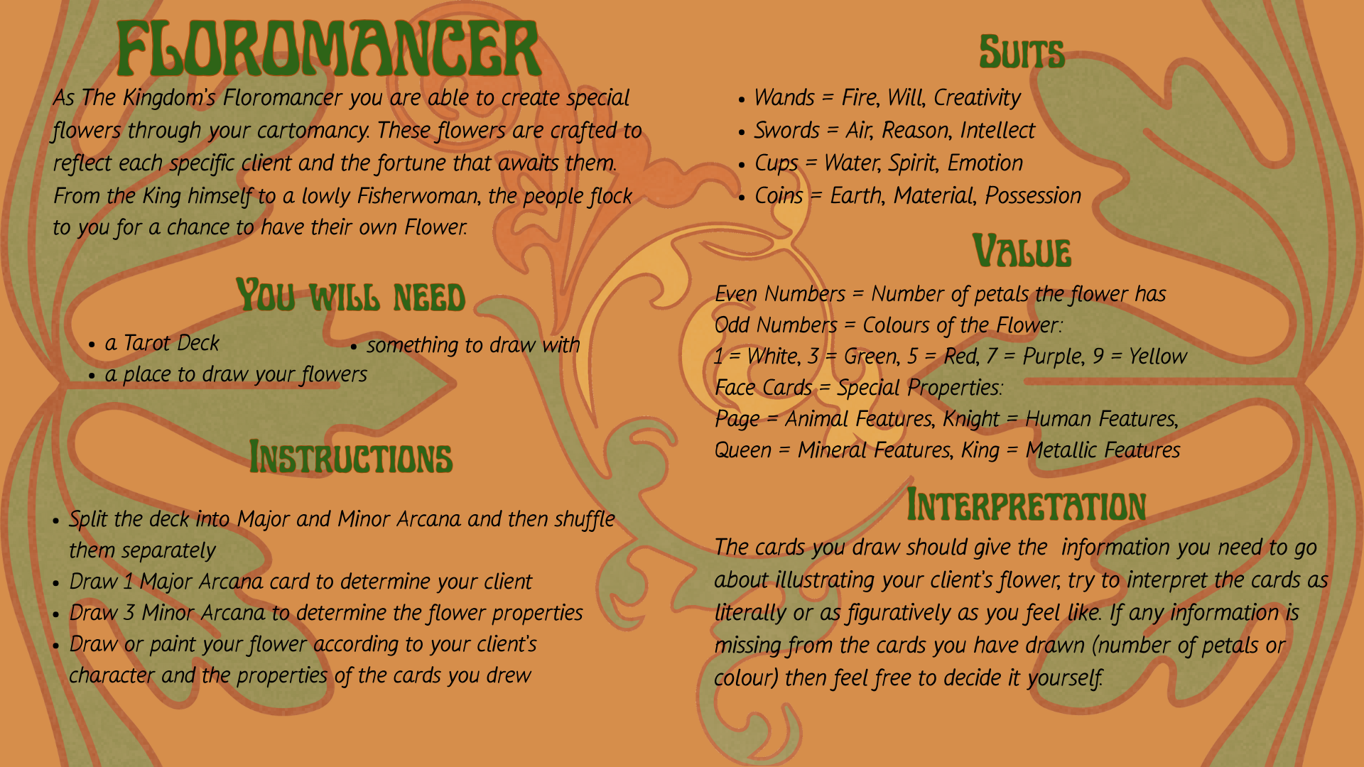 Floromancer is a solo roleplaying drawing game in wich you mix tarot card readings with illustrating beautiful flowers for the citizens of the realm.